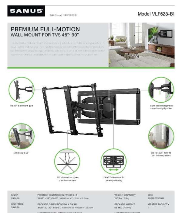 Errol Sykes2026-03-05T20:00:38+00:00Need flexible viewing and clean aesthetics in one solution? The VLF628 full-motion wall mount from @Sanus delivers. 📺 It tilts to eliminate glare, swivels up to 180°, extends 28", and slides side-to-side for precise positioning. With in-arm cable concealment and tool-free adjustability, it's ideal for hospitality spaces that need durable flexibility. Check out the flyer to see how this mount combines smart design with practical features.